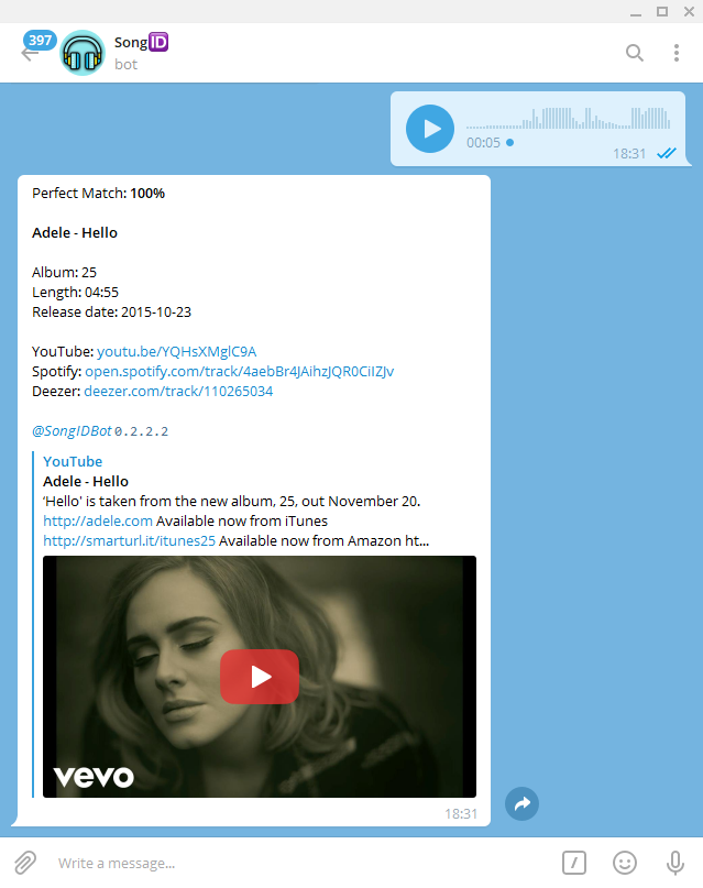 The bot downloads audio and video files it get sent on telegram via the Telegram Bot API, and sends the file to ACRCloud for audio recognition processing.