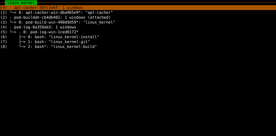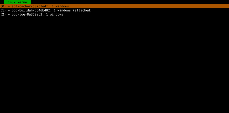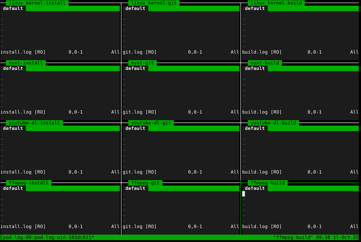 pod-buildah,pod-logandapt-cacher. Each pod-buildah session can have a max of 4 panes and each pod-log session 9 panes, before a new window is created. This behavior can be changed by modifyingMAX_BUILD_PANE="4"MAX_LOG_PANE="12"inpod-buildah/help-steps/variables. 12 log panes seem to be the sweet spot where each pane's log output is still reasonably legible.