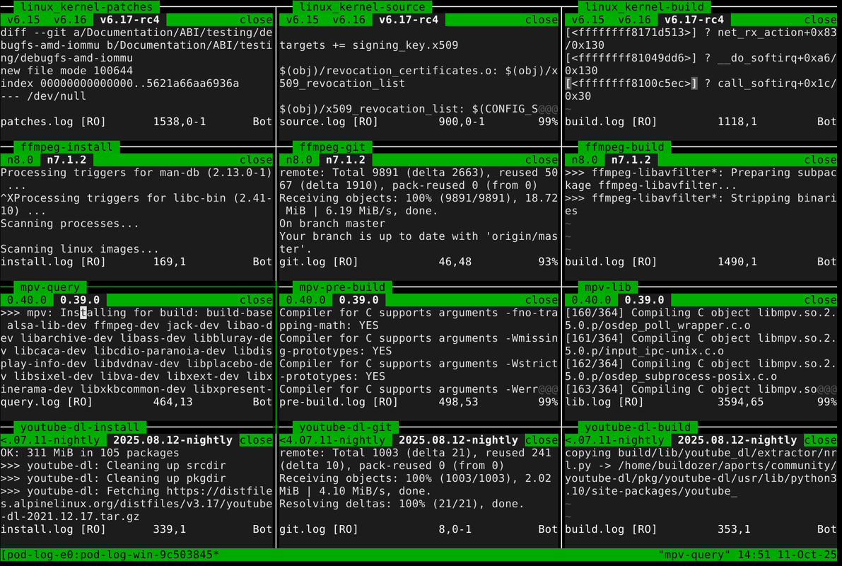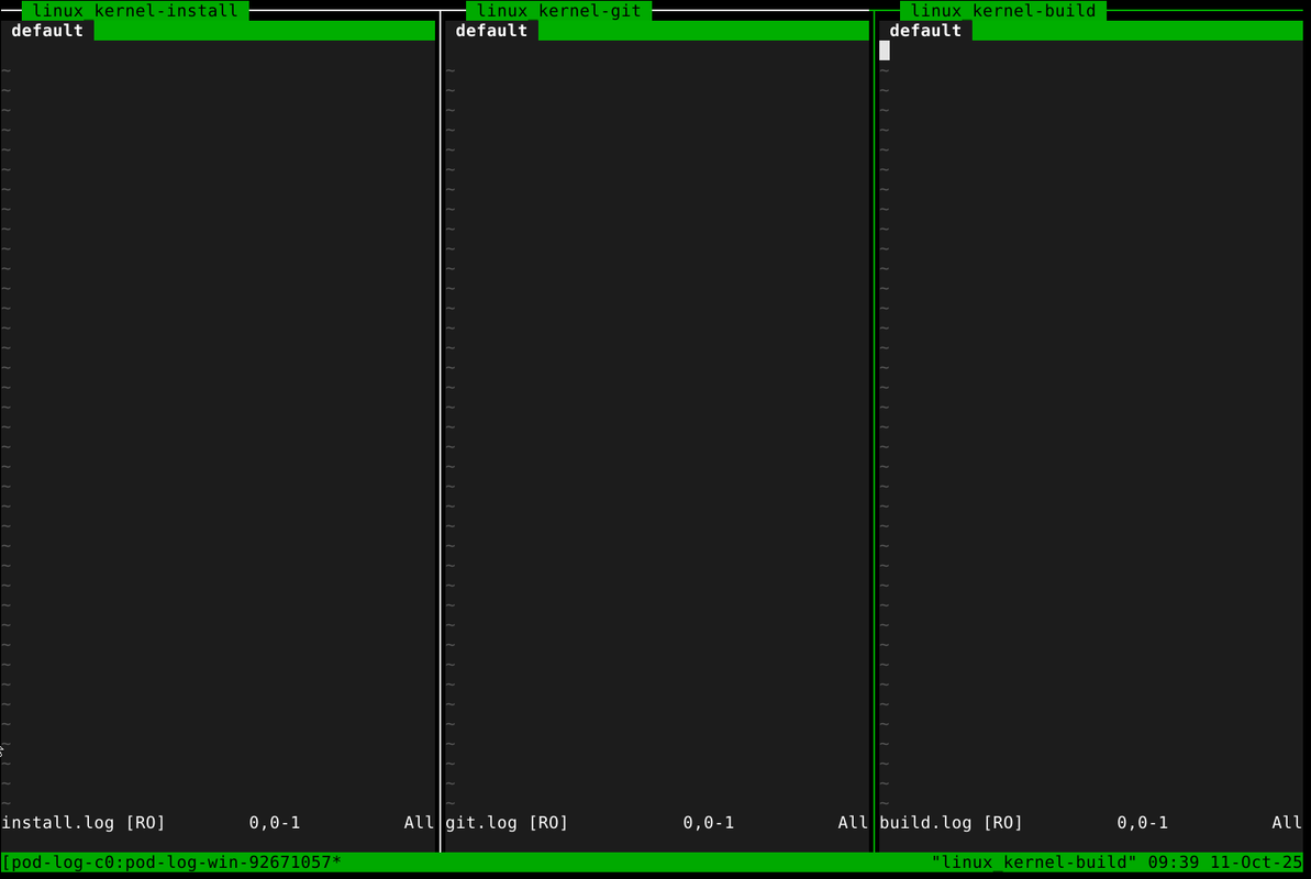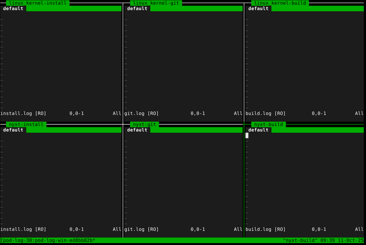 pod-buildah deploys 2 rootless debian bookworm containers which build the nyxt browser and linux kernel. Here is a quick overview of the tmux session layout, logging with neovim and separate container shells.