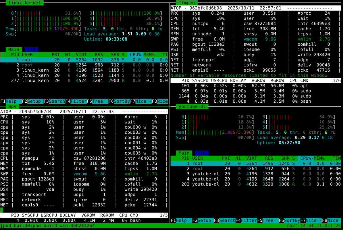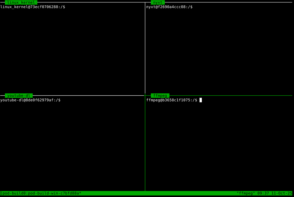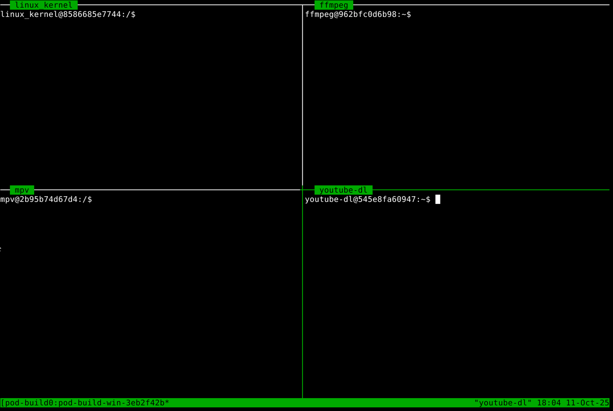 pbused as alias for./pod-buildah)pb -t nyxt -c 'sudo gping google.com --cmd echo -c green -n .2 -b 10' -d pb -t mpv -c 'nyancat -s' -d pb -t ffmpeg -c 'cmatrix' -d pb -t linux_kernel -c 'sleep .2;atop -t 1 -axgm'