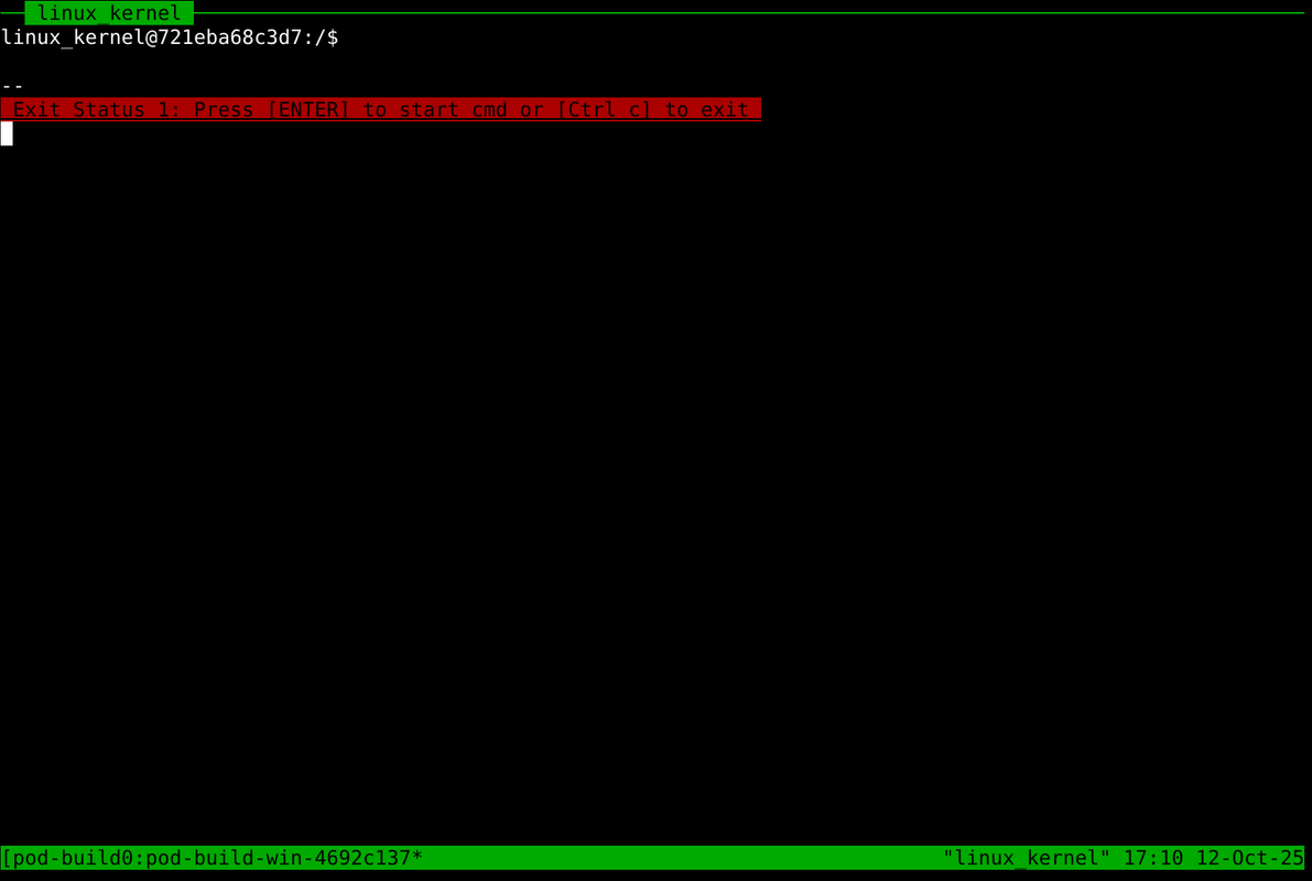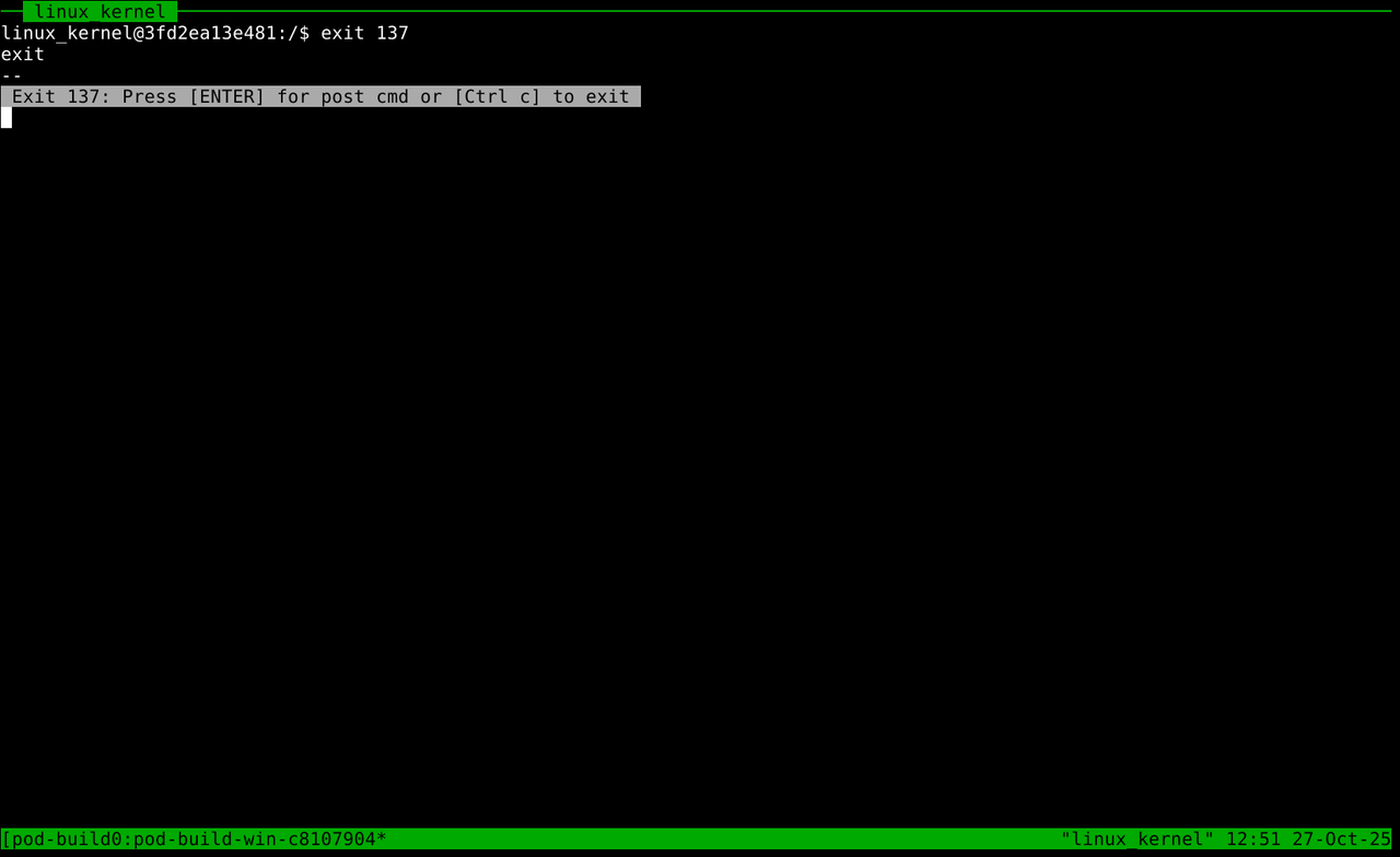 -c|--commandexits or the container itself stops because execution of its main process has finished, the exit status will be indicated graphically by a colored text box in the target container's tmux pane. Since pod-buildah always runs a custom command for each target via tmux, by default/bin/bash, this exit message will always appear in any given pod-buildah tmux pane. When it is visible, a custom post command can be run inside that same tmux pane by pressingEnter. This post command can be controlled with option-tc|--tmux-command. By default, it launches neovim. -