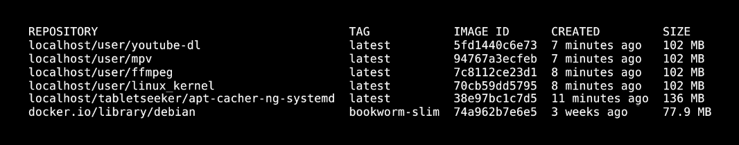 pod-buildah automatically creates 4 customized debian bookworm images and based on them deploys 4 rootless podman containers which build multiple tags of ffmpeg, youtube-dl, linux_kernel and mpv.