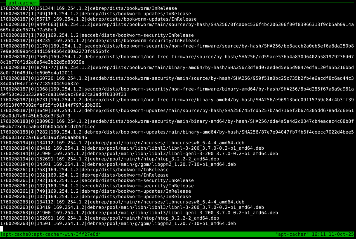 Every container natively uses apt-cacher-ng (also containerized) which is attached to a third and final tmux session. It caches packages during the image creation, container setup and execution of the container process.