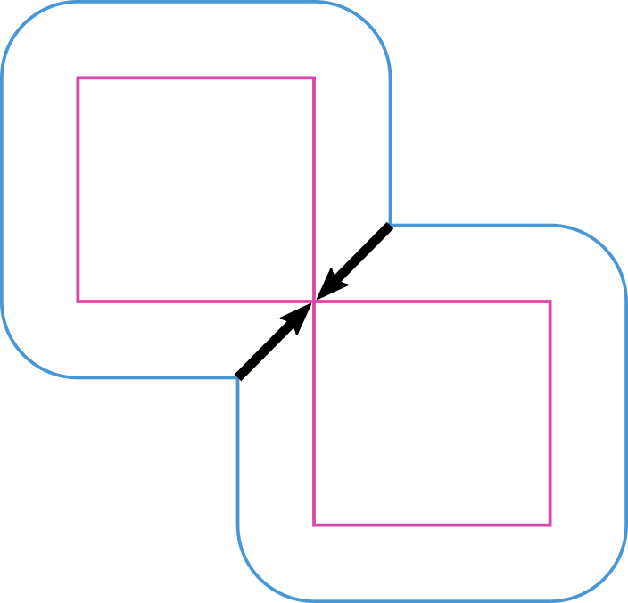 buffer, simplifies them and then contracts them back. This means that a saddle point, where two buildings meet, creates two buffered out points which then collapse back onto exactly the same point when buffered negatively. This can, but doesn't usually, result in a topological error, and creates an invalid polygon.Instead of this, we can buffer out by a very, very slightly smaller value, which should tie-break the points coming back in, and mean that there's enough precision for the inside/outside or left-of/right-of tests to work properly.