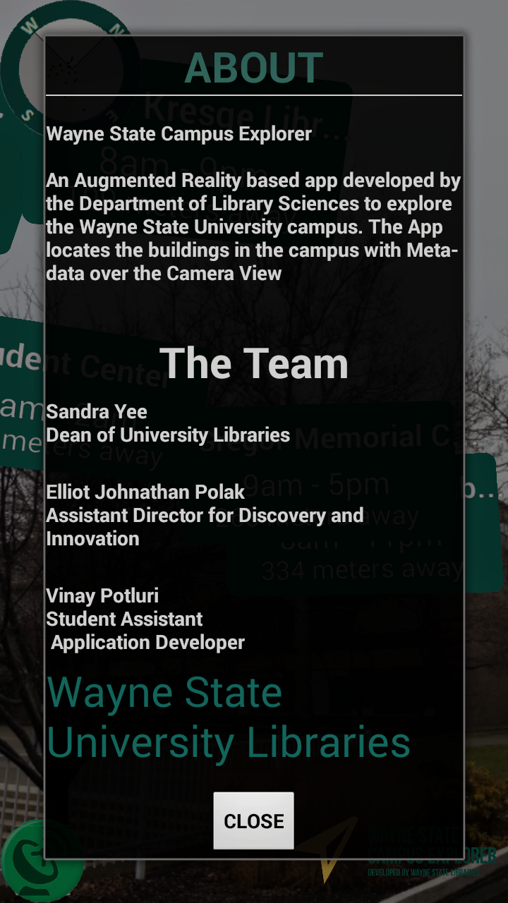 The app is focussed initially to benefit the incoming college freshmen who are totally new to the University and need assistance. The app here acts as a virtual assistant to tour the University. It consists of a camera view with a compass and GPS values combined. The app overlays point of Interests over the screen and changes the Points with orientation of the device.