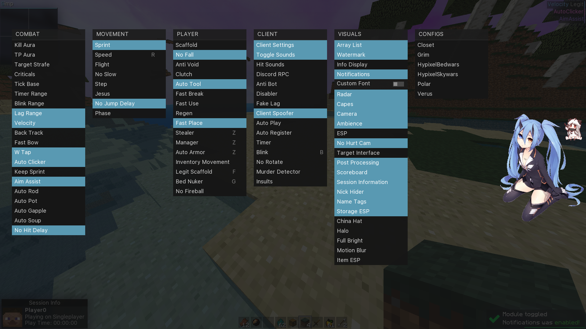 Simp Client is a free, open-source Minecraft client built for any Anti-Cheat but mainly focuses on Polar, Grim, Watchdog, and Verus.
