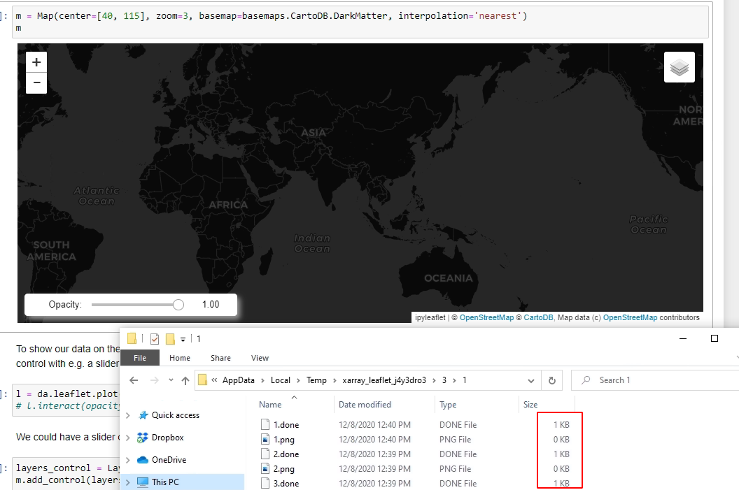 It seems xarray-leaflet is not working properly on Windows. The map tiles could not load. When checking the map tiles under the Temp folders, most tiles are empty. A relevant issue was reported by another geemap user.