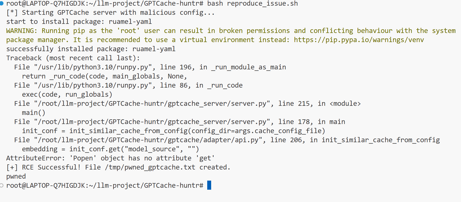 cat /tmp/pwned_gptcache.txt # Output: pwned